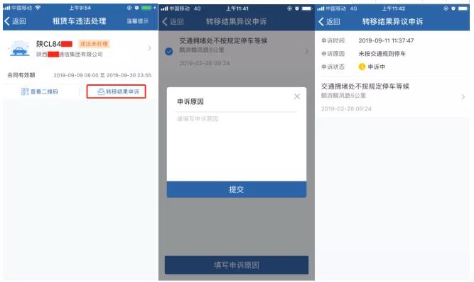 承租駕駛?cè)它c(diǎn)擊【租賃車違法處理】功能,選擇【轉(zhuǎn)移結(jié)果申訴】按鈕進(jìn)入申訴界面。選擇申訴的交通違法行為,采集申訴原因,提交申訴。